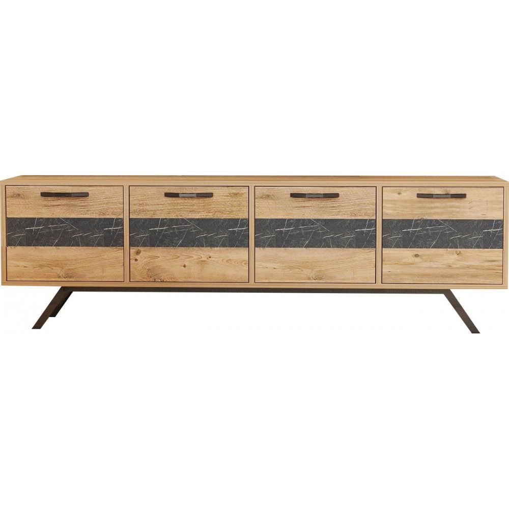 Mediabänk av trä och metall med kantband av PVC.