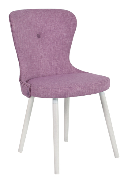 Betty matstol är en stol i modern design. Rundad rygg samt sit- och ryggdel är stoppad med kallskum och klätt med lila tyg för bästa komfort. Runda vita smidiga träben.