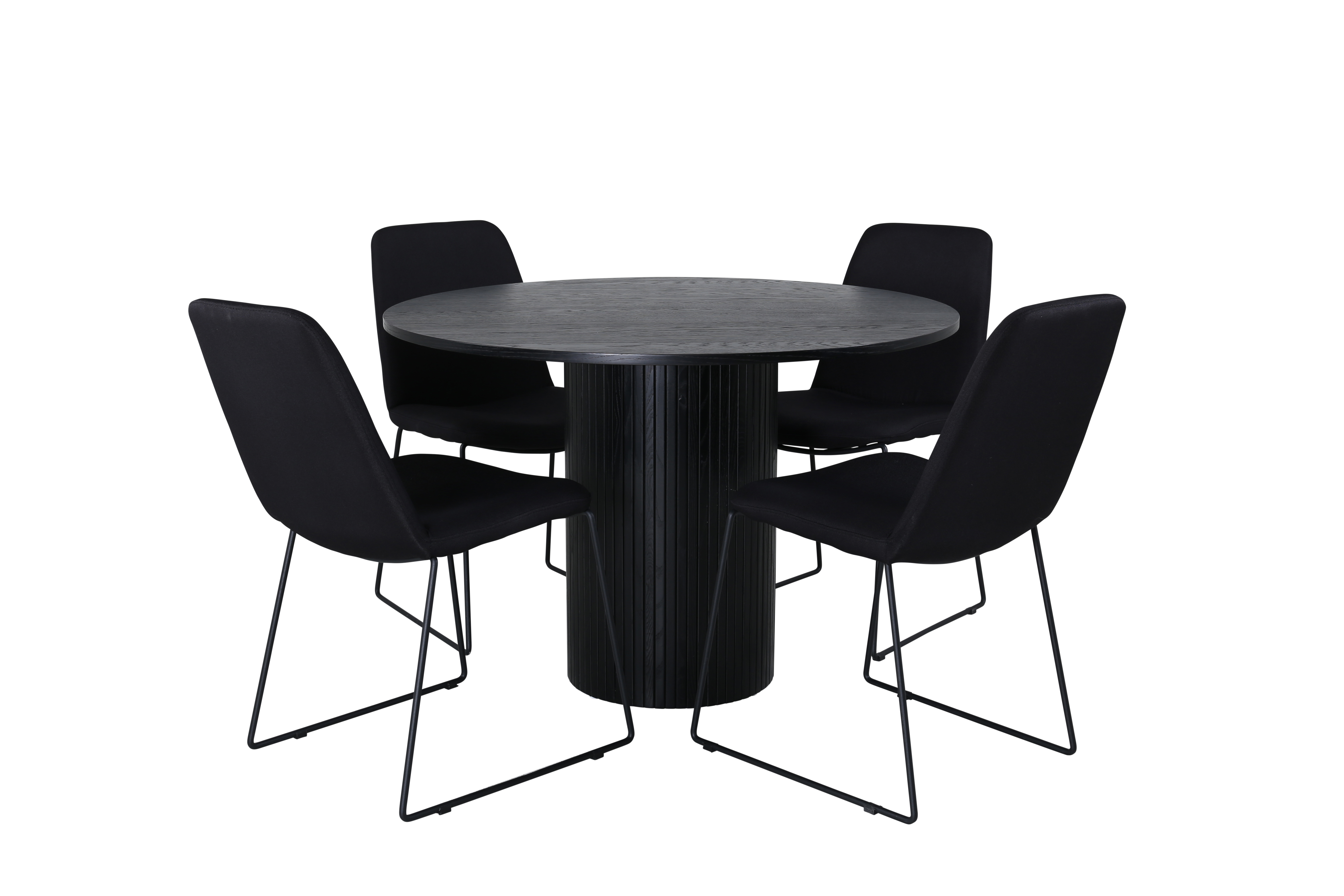 Kombinera robust design med stilren minimalism! Vårt runda matbord Bianca i genomgående svart kulör har en trendig utformning med en bordskiva i MDF och en robust stomme i ribbad design som ger ett stadigt intryck. Här tillsammans med 4st av våra populära Muce matstolar. Stolsbenen är stilrent smala i svart metall och den bekväma sitsen i svart polyester. Låt hemmets hjärta präglas av din nya iögonfallande matgrupp.