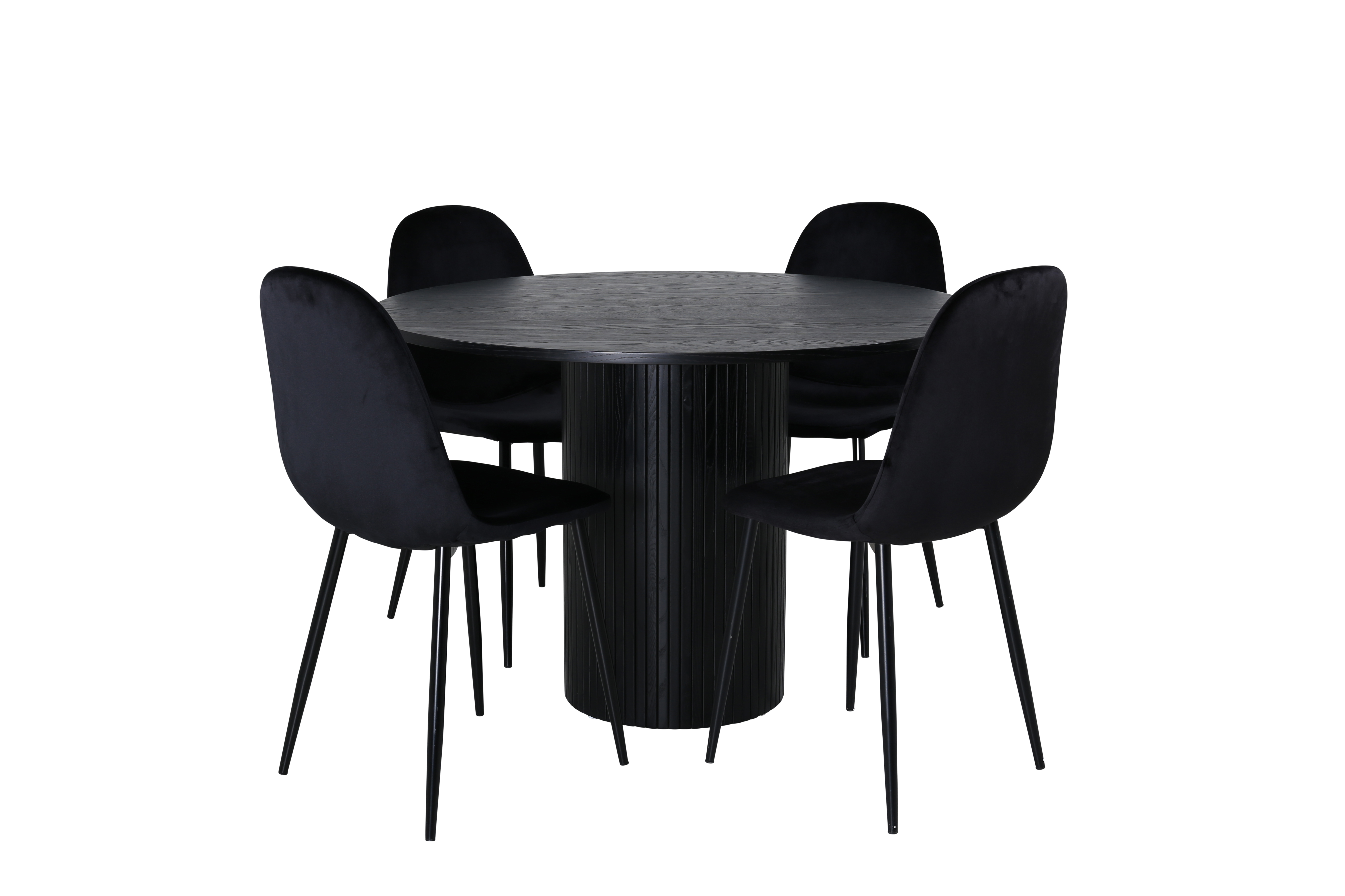 Stilsäkert och elegant - en svart matgrupp är enkel att matcha och går aldrig ur tiden! Kring vårt runda matbord Bianca skapar du en härlig gemenskap där ingen riskerar hamna på kanten. Bordsskivan är tillverkad i MDF och har en cylinderformad stomme i bastant utformning och ribbad design. Den genomgående svarta kulören är lika tidlös som snygg och enkel att matcha med övrig inredning. Kombineras utmärkt med 4st Polar matstolar i svart sammetstyg som ger ett fint lyster och stolsben i metall.