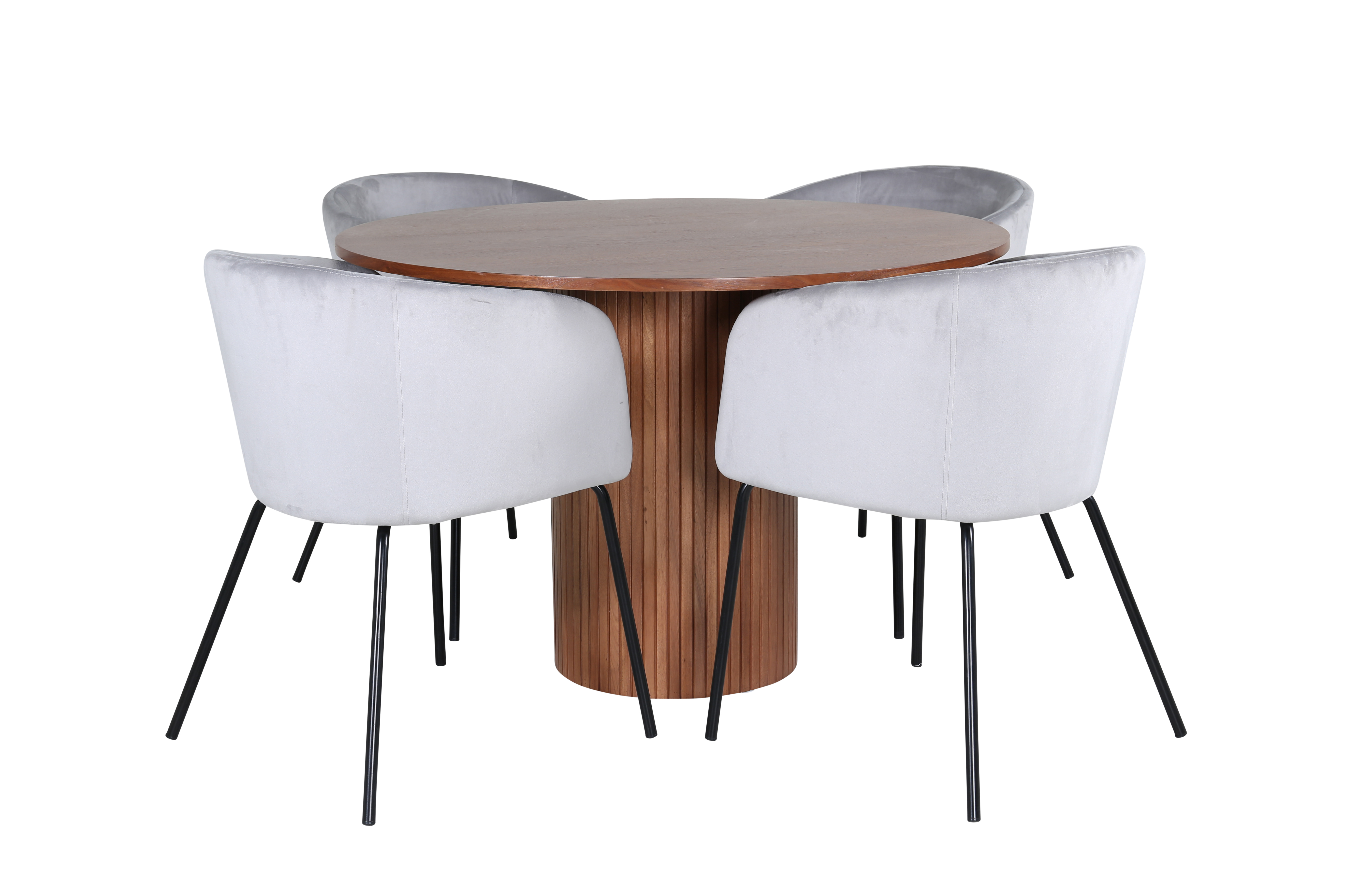 Stilrent och elegant - sätt en modern prägel på inredningen! Vårt runda matbord Bianca i trendig valnötskulör passar perfekt i både vardagsrummet eller det rymliga köket. Bordskivan är valnötsfärgad MDF med faner och stommen robust i valnöt samt svart kulör av trä och MDF i en ribbad design som ger ett stadigt intryck. Matchas här med 4st Berit matstolar i lyxig utformning. Sitsen är mjuk i ljusgrå sammet och stolsbenen stilrent smala i svart järn. Skapa ett inbjudande blickfång i hemmets hjärta!