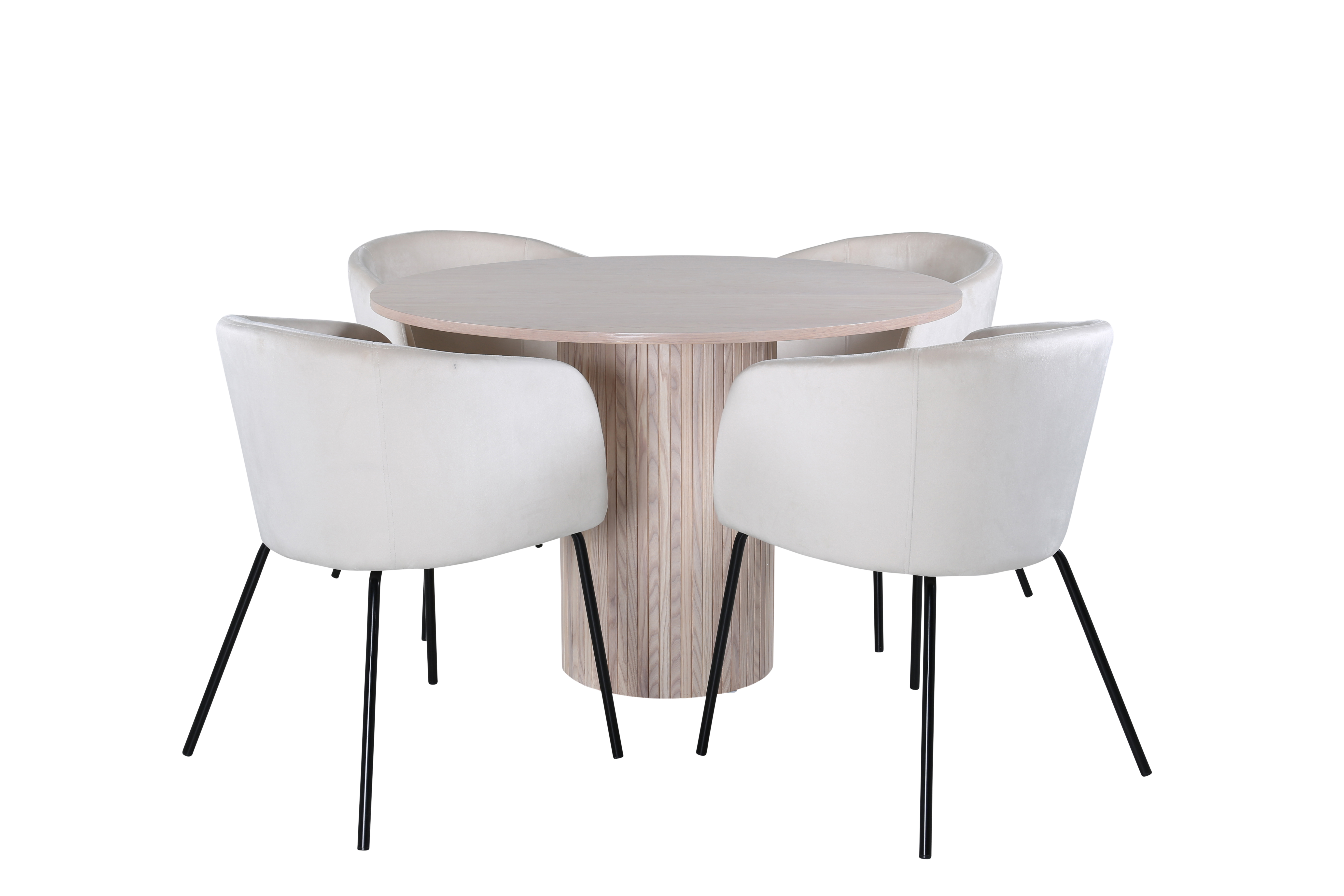 Skapa en härlig gemenskap kring vårt runda matbord Bianca i modemedveten design! Bordsskivan är tillverkad i MDF och har en cylinderformad stomme i robust utformning och ribbad design. Den genomgående putsade vita kulören är lika tidlös som snygg och enkel att matcha med övrig inredning. Kombineras här med 4st Berit matstolar i lyxig design. Stolarnas pampiga utformning med en beige sits i mjukt sammetstyg och smala stolsben i järn skapar en inbjudande atmosfär.