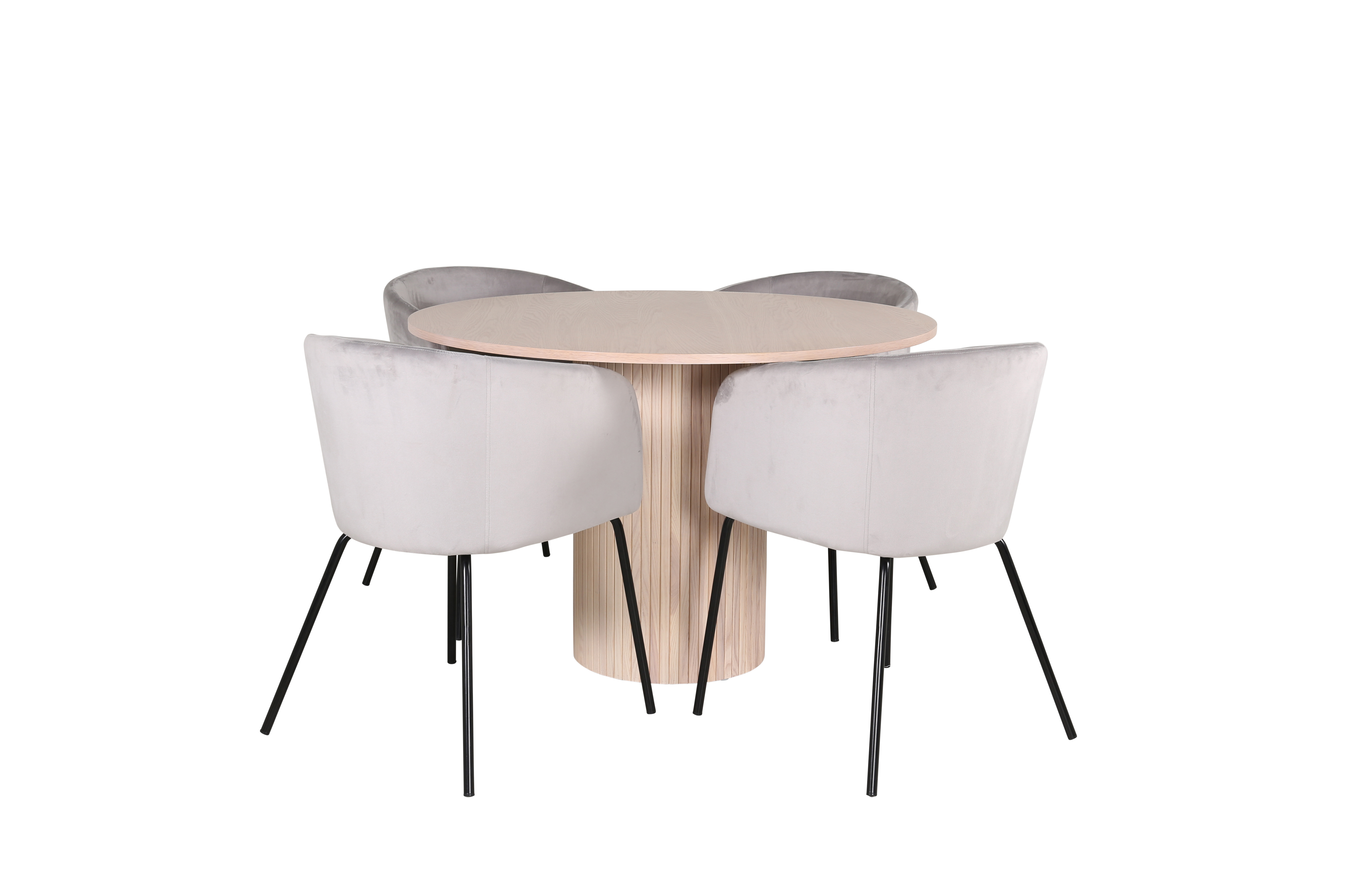 Skapa en härlig gemenskap kring vårt runda matbord Bianca i modemedveten design! Bordsskivan är tillverkad i MDF och har en cylinderformad stomme i robust utformning och ribbad design. Den genomgående putsade vita kulören är lika tidlös som snygg och enkel att matcha med övrig inredning. Kombineras här med 4st Berit matstolar i lyxig design. Stolarnas pampiga utformning med en läcker grå sits i mjukt sammetstyg och smala stolsben i järn skapar en inbjudande atmosfär. Inred inbjudande och stilrent!