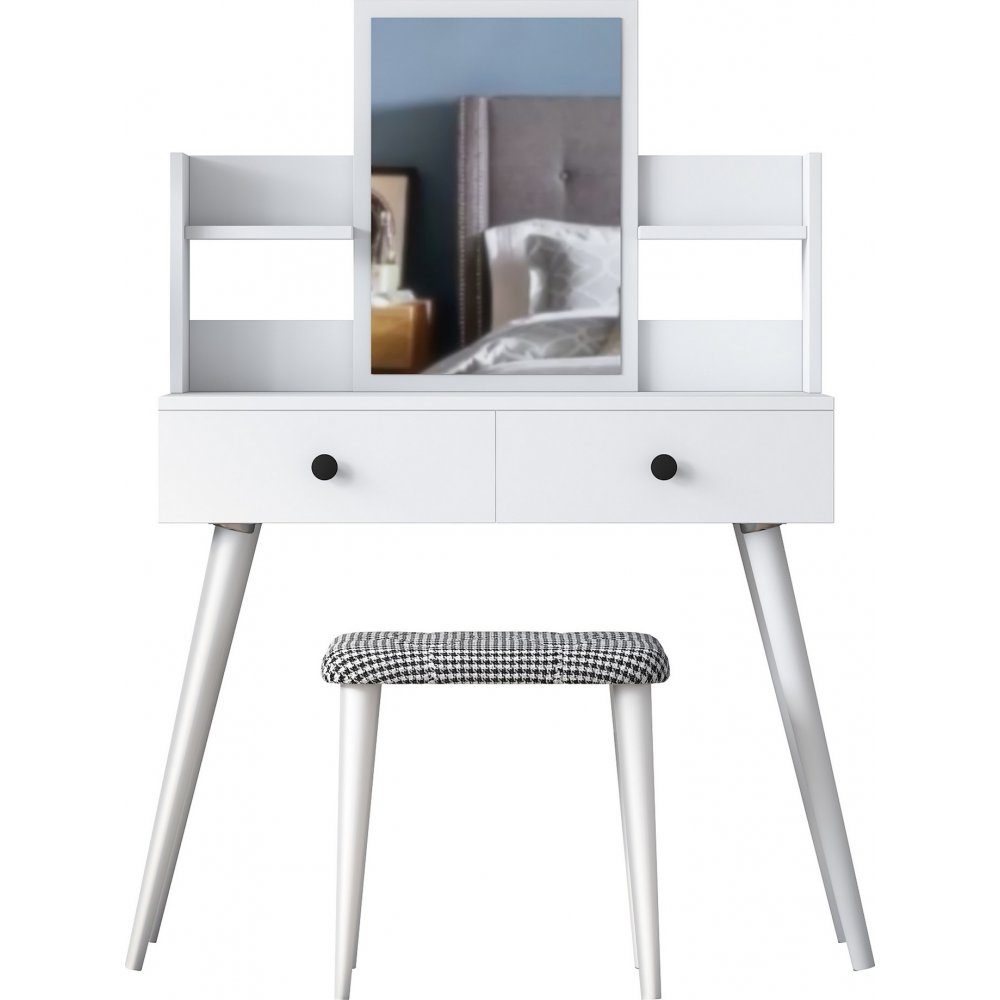 Sminkbord av trä med spegel och pall.