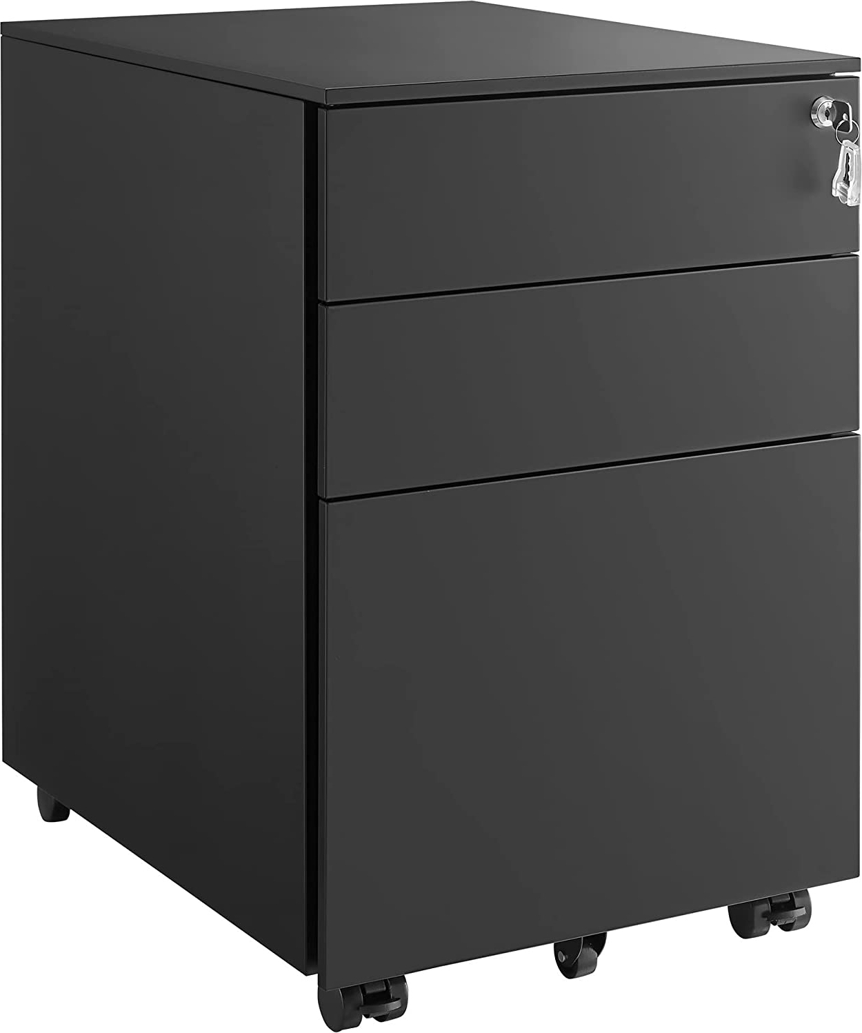 Arkivskåp av stål. Låsbart skåp på hjul. Två av hjulen har broms och understa lådan har ett eget hjul för stabilitet.
