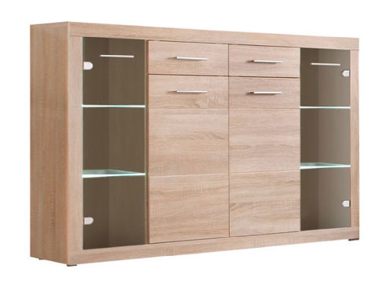 Ett sideboard i ek med fyra skåp varav två är i glas. Två praktiska hyllor finns ovanför dörrarna i mittsektionen och en integrerad LED-belysning bakom dörrarna i glas som blir en effektfull detalj på möbeln.