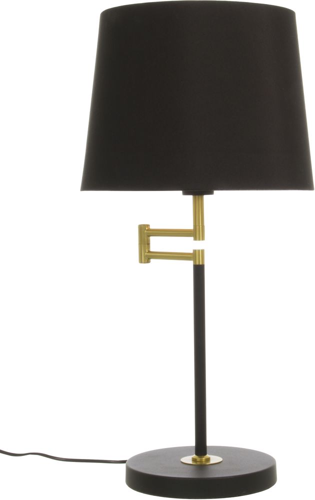 Bordslampa i metall med svart och matt mässings utförande. Lampskärm i textil ingår.