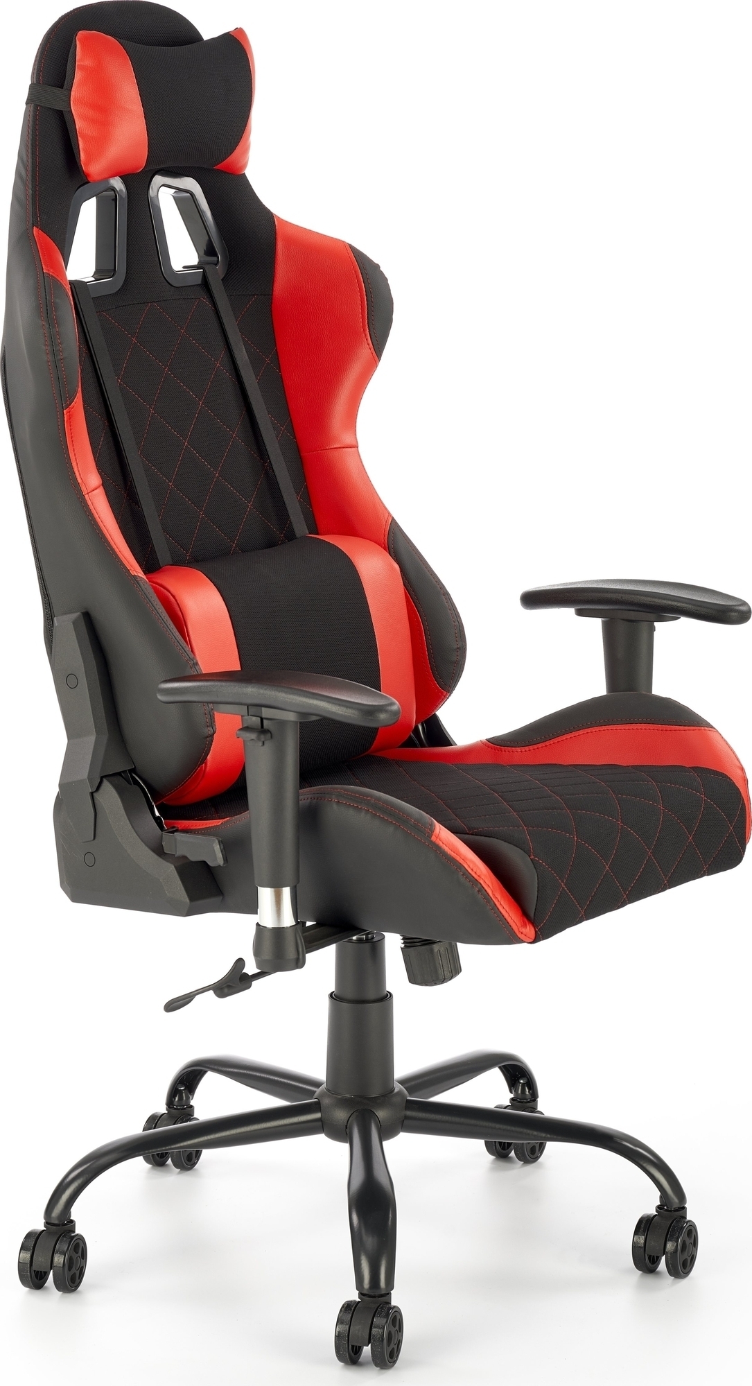 Kontorsstol med underrede av metall och klädsel av tyg.