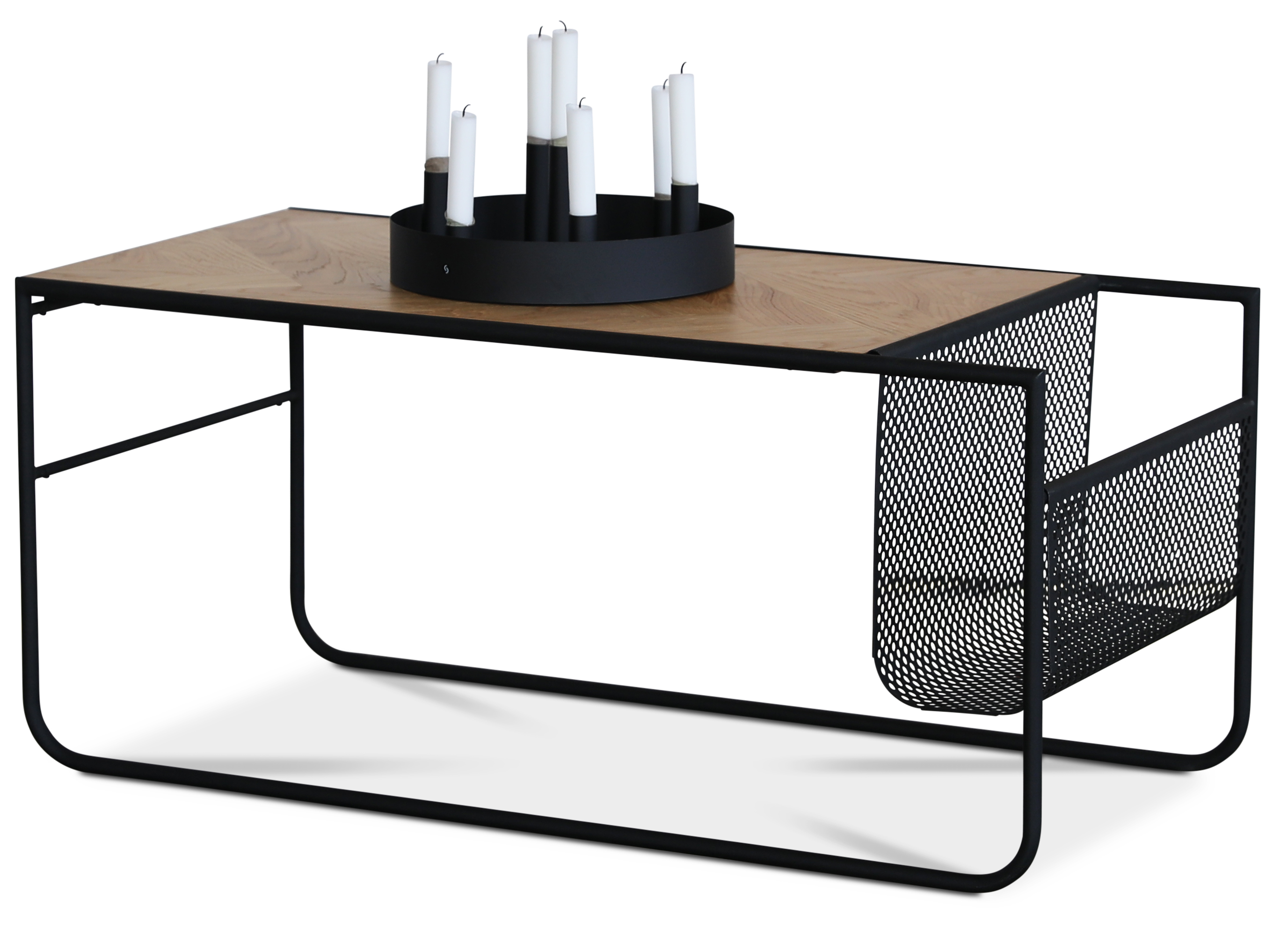 Modernt soffbord med toppskiva i ekfanerad fiskbensmönster. Svart metallstomme med förvaringsplats i perforerad metall.