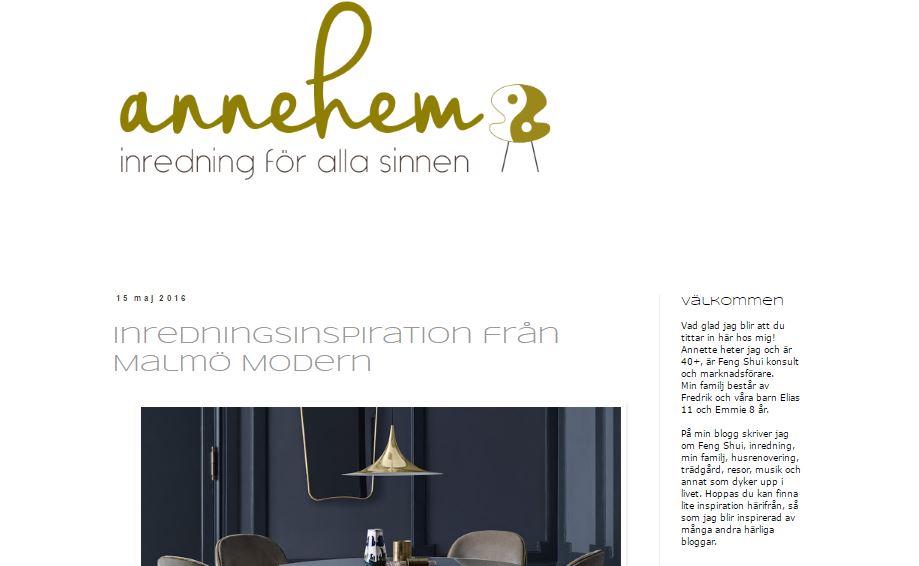 Annehem Annettes blogg handlar om inredning, husrenovering och trädgård men också familjen och andra intressen i livet som musik, resor och matlagning, det goda i livet helt enkelt. Annette arbetar som marknadsförare och fengshuikonsult och beskriver sina inredningsidéer med fina exempel nästan alltid med en fengshiutanke bakom. Letas det sammetsgardiner kan man räkna med blogginlägg om det. Har Annette varit på en inspirerande plats kan vara ett växthus eller resa med vänner så får vi ta del av bilder därifrån och någon gång ibland smyger sig ett recept på något gott in i bloggen som t ex färska vårrullar med sting eller kålpudding. Allt kommer i ett härligt flöde det görs inga försök att kategoriera.