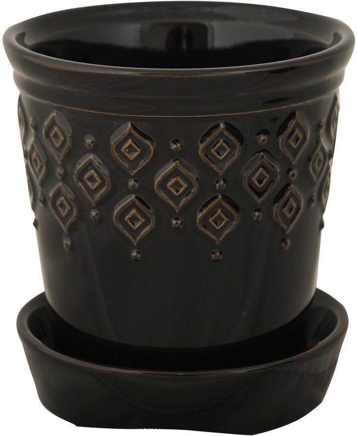 Blomkruka i glazed svart keramik med vattenfat.
