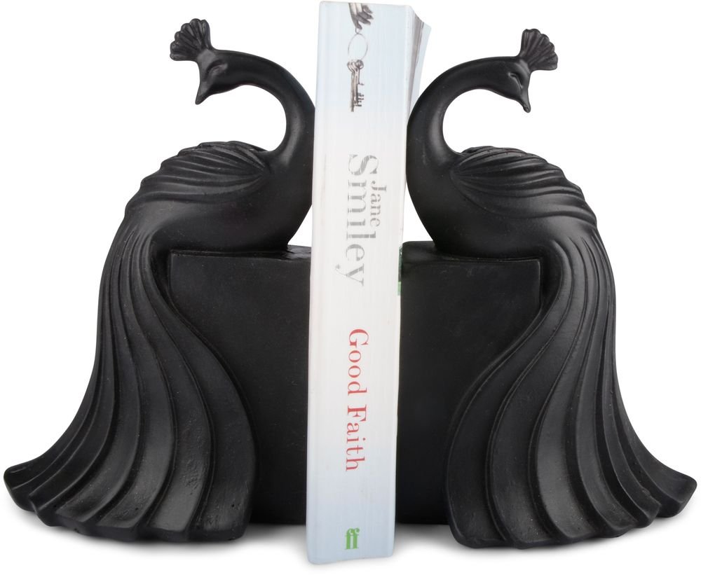 Ett snyggt och dekorativt bokstöd i svart polyresin som efterliknar en påfåglar. Kommer i set om två