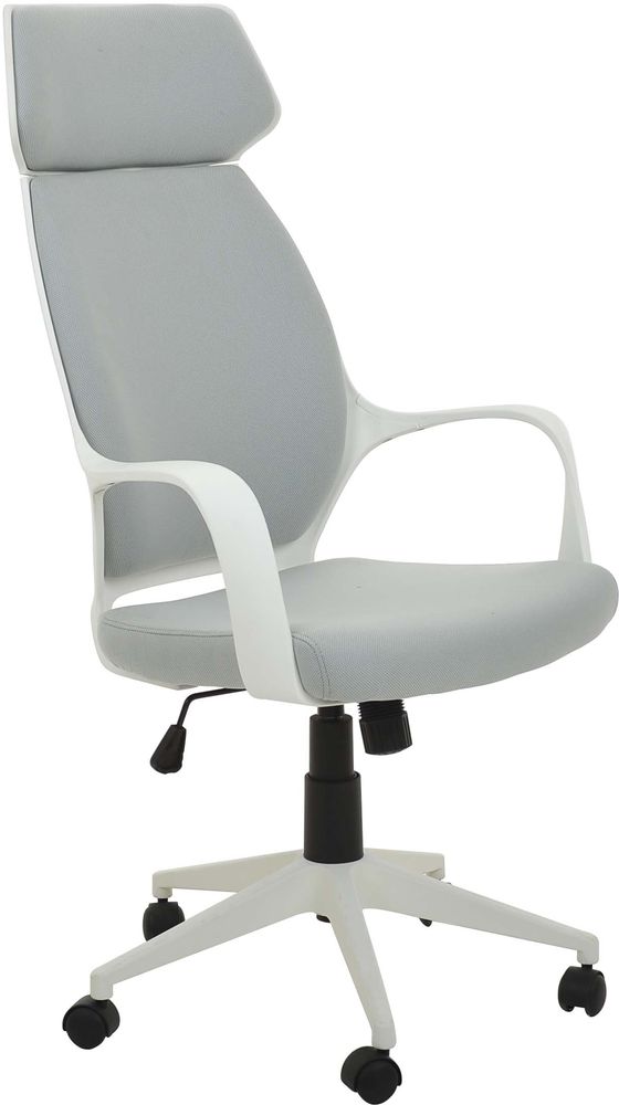 Skrivbordsstol i grått tyg med vit stomme. Justerbart ryggstöd, sits och höjd.