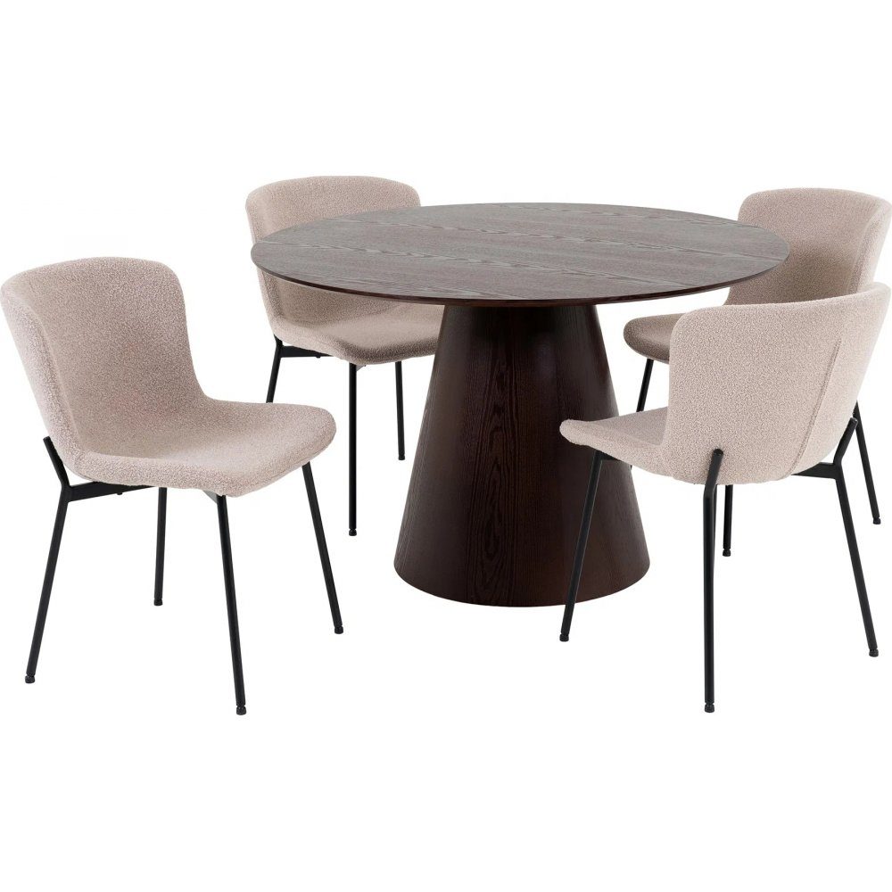 Matgrupp bestående av Bolton matbord i valnötsfanér och 4 st Maceda matstolar i beige bouclétyg. Levereras omonterad.