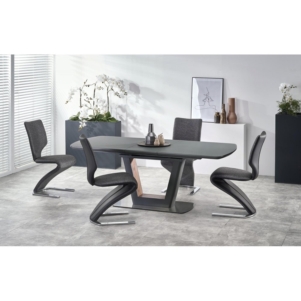 Ett fint matbord med en modern design. Bordsskivan är tillverkad av lackerad MFP (premium träskiva) och underredet är av en vacker blandning av lackerad MFP (premium träskiva), fanér och rostfritt stål. Bordet är praktiskt då du lätt kan förlänga bordsskivan upp till 200 cm, tilläggsskiva ingår.