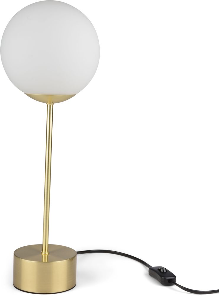 En praktisk bordslampa med guldfärgad metallfot och vit glaskupa.