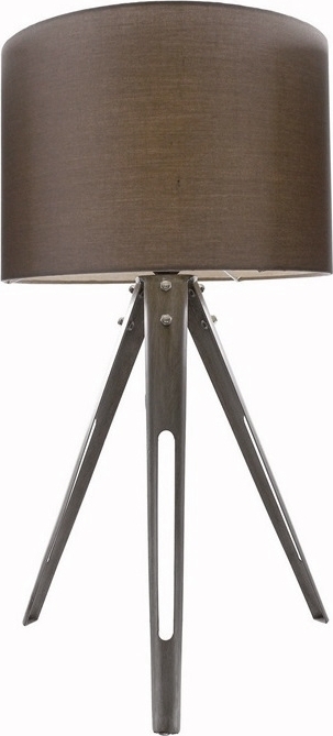 Bordslampa Tripod är en bordslampa med brungrå målad fot och lampskärm i gråbrunt tyg.