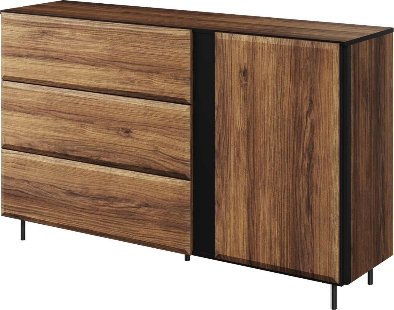 Byrå av trä med ben av metall och handtagslösa dörrar som öppnas genom att trycka på dem. Levereras omonterad.