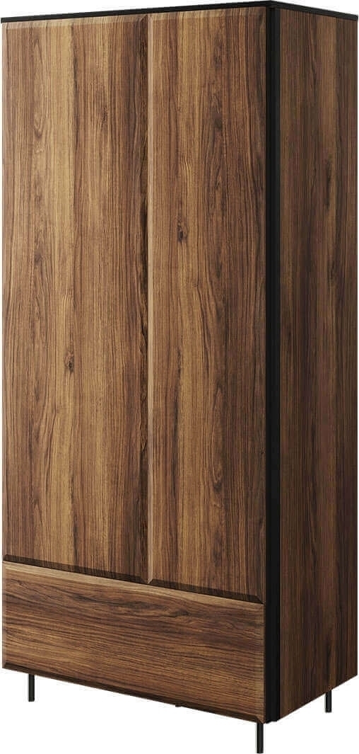 Garderob av trä med ben av metall. Handtagslösa dörrar som öppnas genom att trycka på dem. Levereras omonterad.