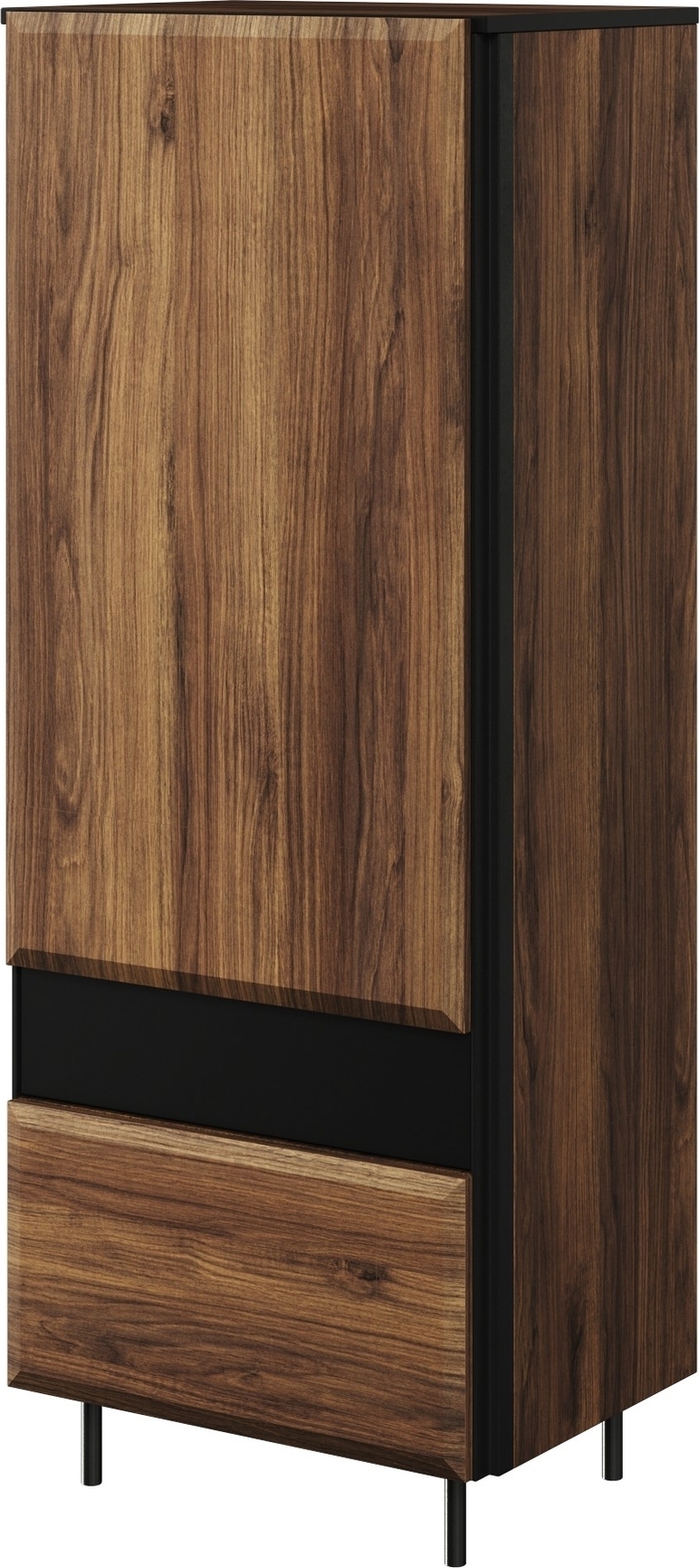 Skåp av trä med ben av metall. Handtagslösa dörrar som öppnas genom att trycka på dem. Levereras omonterad.