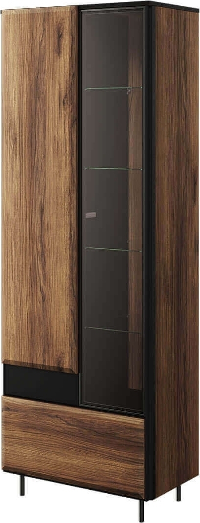 Vitrinskåp av trä med ben av metall och en dörr med tempererat glas. Handtagslösa dörrar som öppnas genom att trycka på dem. Belysning av den inglasade delen finns som tillval i form av 5 st riktbara LED-lampor Levereras omonterad.