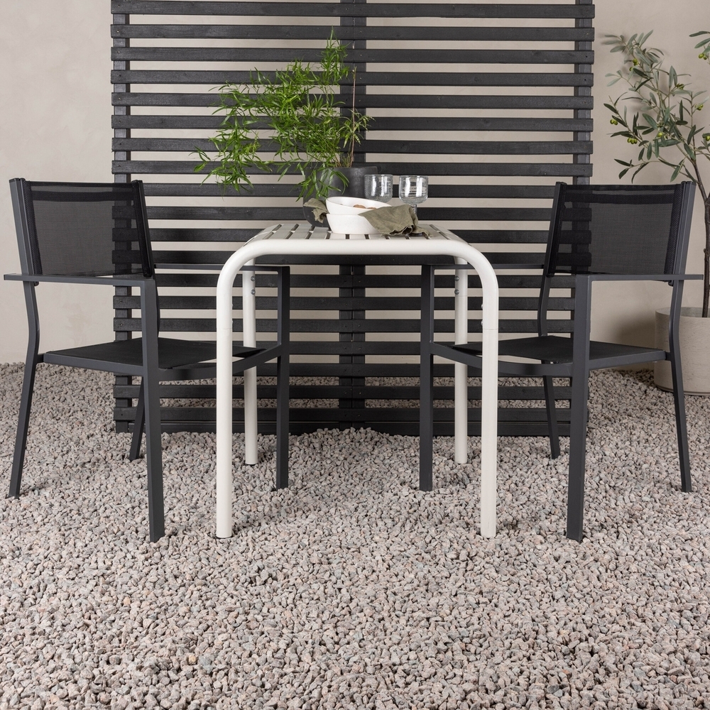 En perfekt cafégrupp till den lilla balkongen eller uteplatsen! Bordet från serien Borneo har följsamma former och en tidlös Skandinavisk design. Bordsskivan är ribbad och böljar ner längs kanterna vid benen. Genomgående tillverkat i beige aluminium vilket ger dig ett slitstarkt bord som är enkelt att flytta omkring på. Här i snygg kombination med 2st matstolar från serien Copacabana. Stolarna har raka nordiska former och är stapelbara. Sitsen är i textilene och stolsbenen i svart aluminium. Duka ut fikan i sommar och njut av trivsamma stunder!