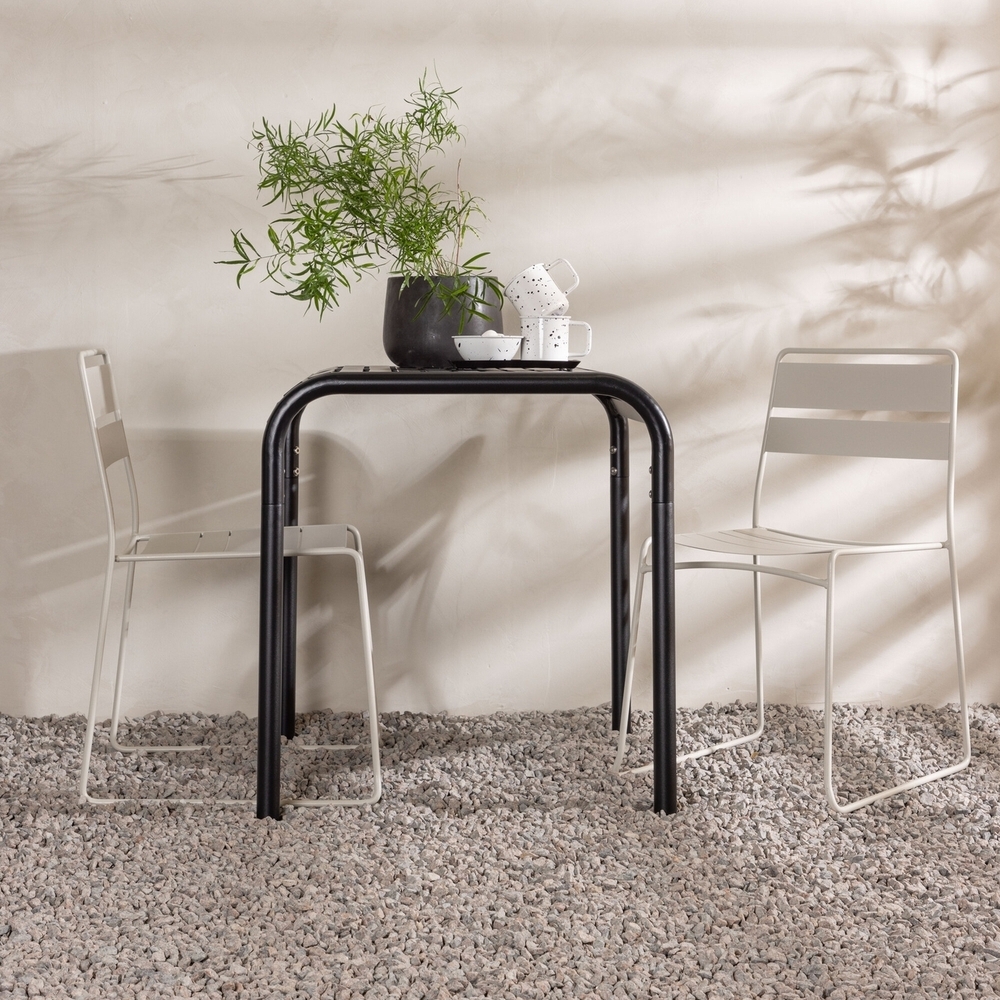 Stilrent och minimalistiskt - perfekt för den lilla balkongen eller uteplatsen! Bordet från serien Borneo har följsamma former och en tidlös Skandinavisk design. Bordsskivan är ribbad och böljar ner längs kanterna vid benen. Genomgående tillverkat i svart aluminium vilket ger dig ett slitstarkt bord som är enkelt att flytta omkring på. Här tillsammans med våra smakfulla matstolar från serien Lina. Den nätta stolen är i beige stål och matchar bordet utmärkt. Njut av soliga fikastunder i sommar!