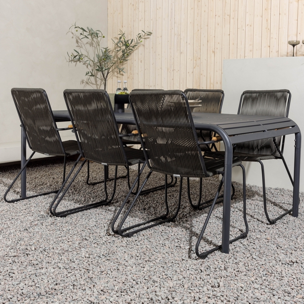 Sätt en personlig prägel på inredningen med en modern och fräsch matgrupp! Det rektangulära matbordet Borneo har följsamma former med en ribbad bordsskiva som böljar ner längs kanterna vid benen. Genomgående tillverkat i det slitstarka materialet aluminium. Här tillsammans med gråa matstolar från serien Bois. Stolen har en bekväm design med armstöd i teak, ram i svart stål och sits i mörkgrått rep. Sitt bekvämt och bjud in till härliga måltider utomhus! Bordets mått: 200x100x75cm.