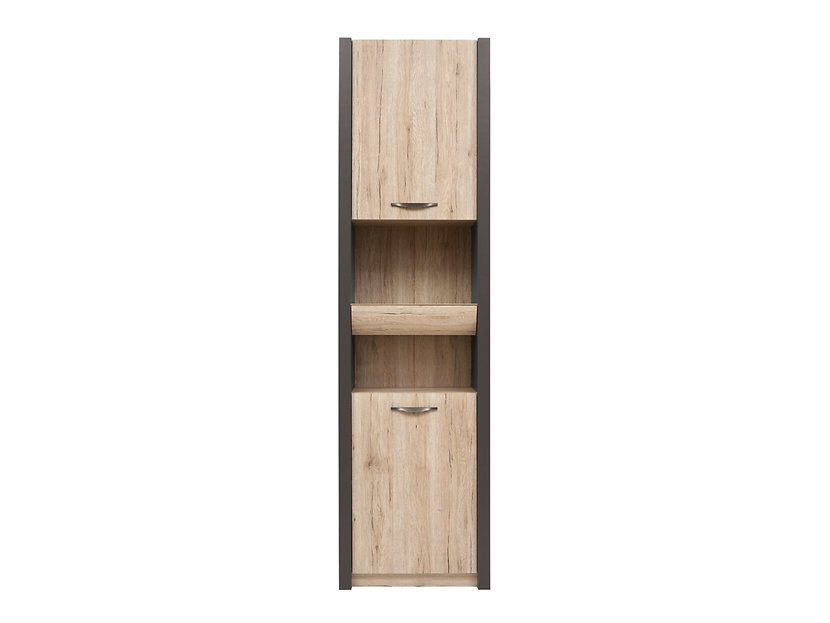 En fin bokhylla i ekimitation med grafitgråa sidor. Med det öppna facket i mitten har du snabbt tillgång till dina vardagliga föremål, inuti skåpen finns funktionella hyllplan som hjälper till att hålla ordning o reda! Bokhyllan kan med fördel kombineras ihop med andra möbler ur samma möbelserie för att få den ultimata förvaringen på t.ex ditt kontor.