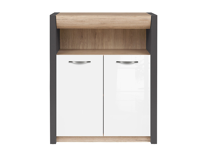 Ett fint skåp i ek-imitation med grafitgråa sidor och vita fronter. Med det öppna facket har du snabbt tillgång till föremål som används dagligen. Inuti skåpet finns funktionella hyllplan som hjälper dig att hålla ordning och reda. Lådan som finns över det öppna facket är praktiskt att förvara viktiga eller mindre föremål. Skåpet kan med fördel kombineras ihop med andra möbler ur samma möbelserie för att få den ultimata förvaringen på t.ex ditt kontor.
