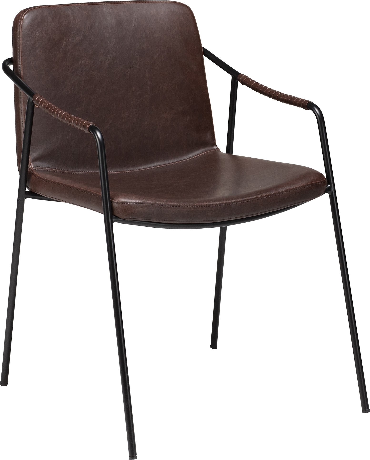 Nätt och stilren matstol från danska Dan-Form. Stolen har en modern retrostil och erbjuder en härlig sittkomfort. Stommen är tillverkad av svart pulverlackad metall med en sits och rygg i vadderat konstläder. Lädret har en snygg vintagedesign och armstöden är elegant klädda med samma läder för att ge armarna en skönare känsla.