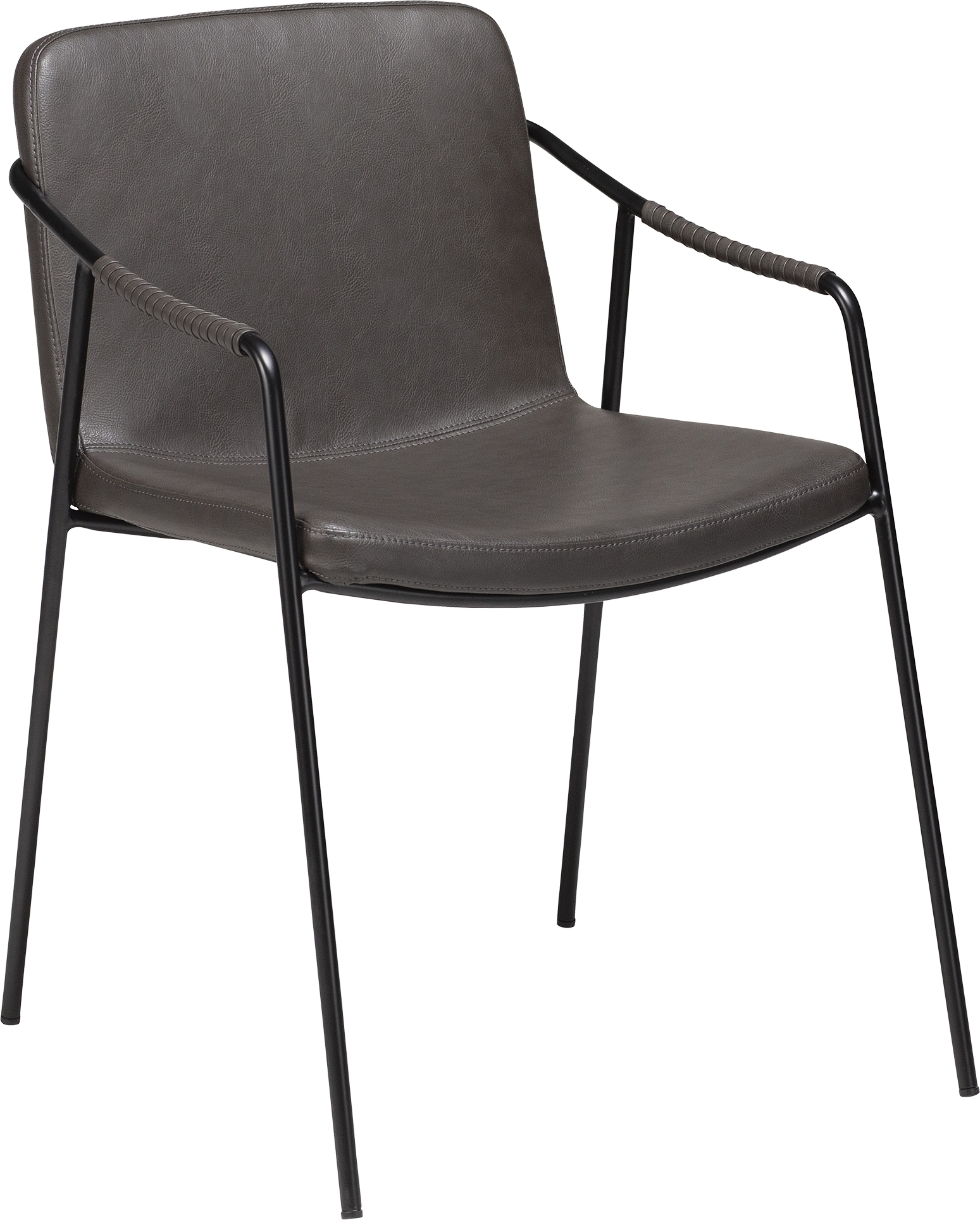 Nätt och stilren matstol från danska Dan-Form. Stolen har en modern retrostil och erbjuder en härlig sittkomfort. Stommen är tillverkad av svart pulverlackad metall med en sits och rygg i vadderat konstläder. Lädret har en snygg vintagedesign och armstöden är elegant klädda med samma läder för att ge armarna en skönare känsla.