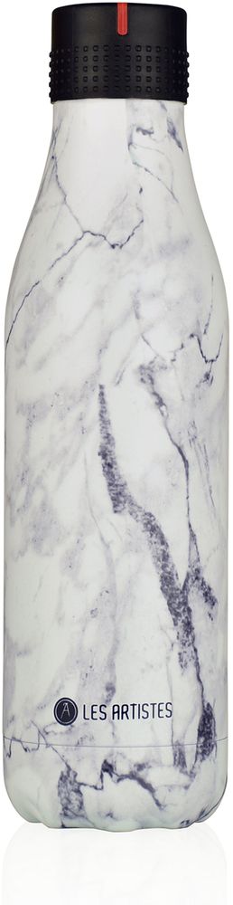 Snygg termoflaska i vitt mönster med svart lock. Flaskan är tillverkad av högkvalitativt 18/8 stål.