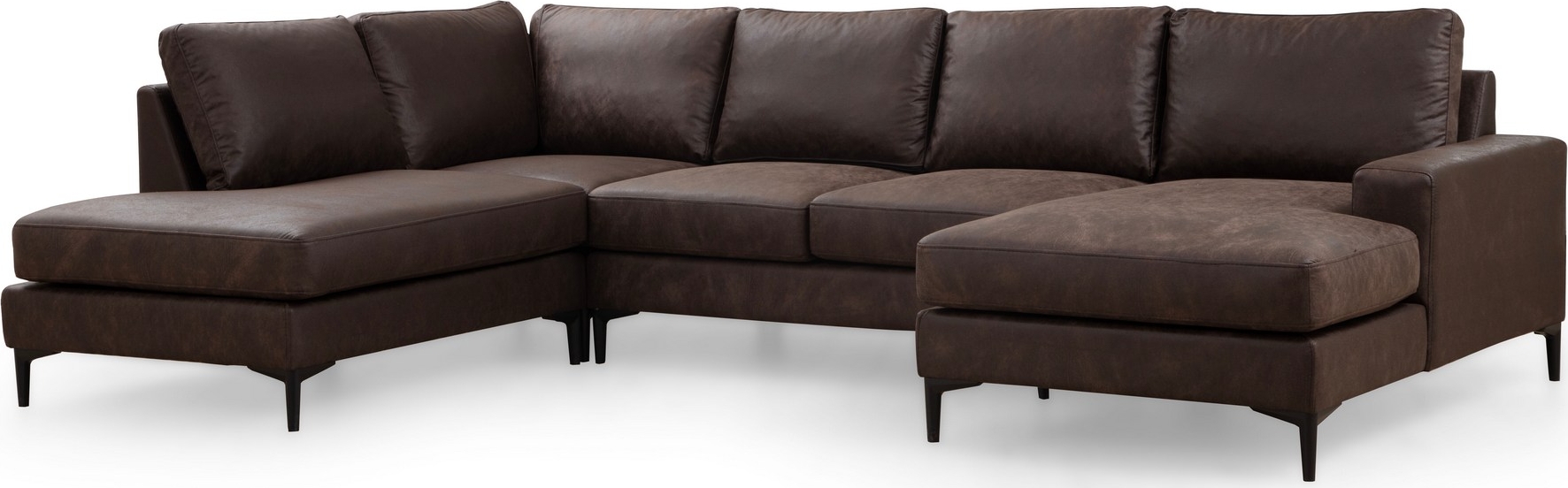 U-soffa av bokträ och spånskiva. Klädsel av polyester och ben av plast. Fasta sitt- och ryggdynor.