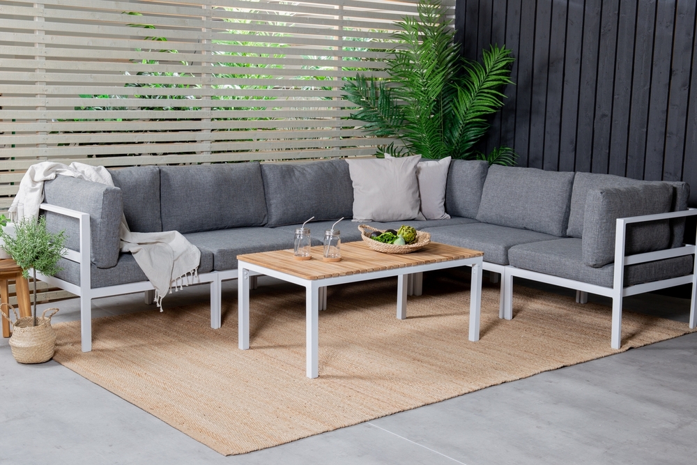 Skapa ett stilrent blickfång till uteplatsen med ett soffbord från serien Brasilia! Den genomtänkta rektangulära designen är stilren med raka nordiska former som ger ett luftigt intryck till möbleringen. Soffbordet har en bordsskiva i vacker teak och ett underrede i vit aluminium. Här tillsammans med en hörnmodul från serien Copacabana i vit aluminium och grå dynor - skapa plats för en till!