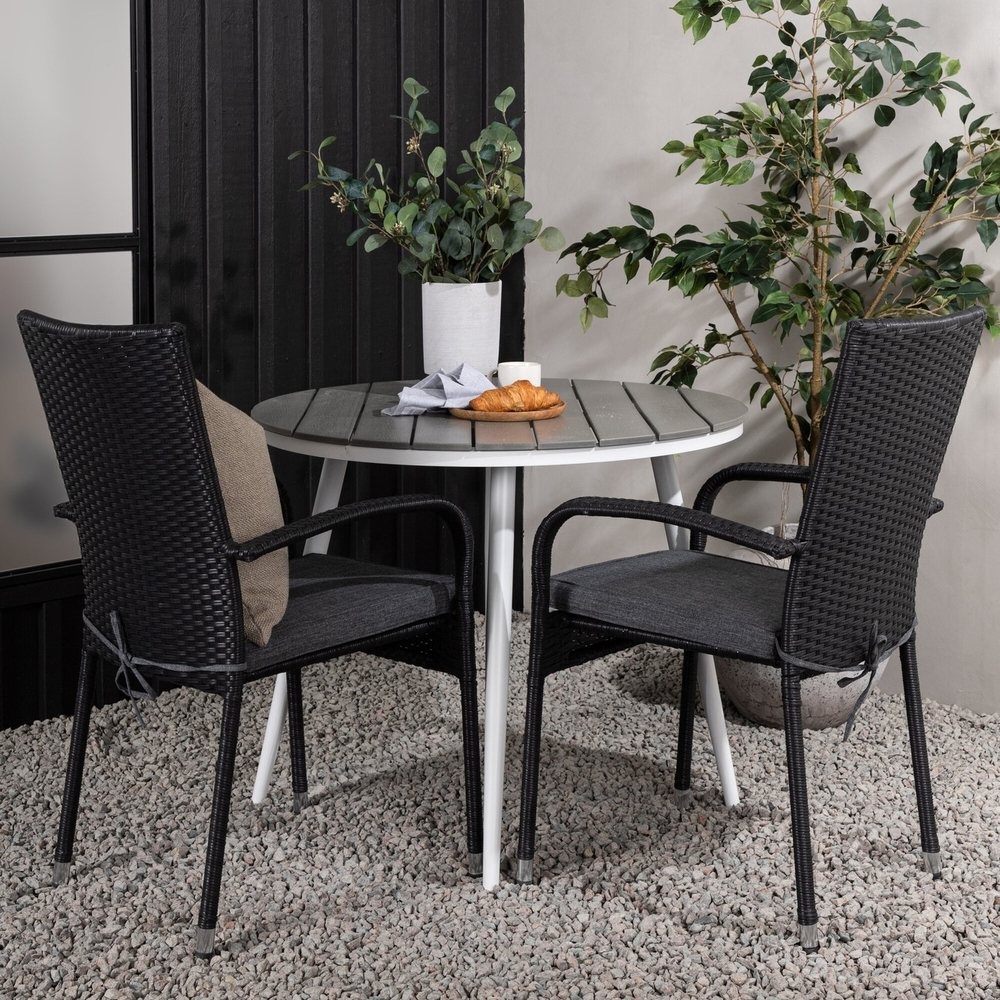 Bekväm, inbjudande och nätt cafégrupp i behagliga kulörer - enkel att matcha och tidlös i sitt utformande! Bordet Break har en rund bordsskiva i grå Aintwood och ett klassiskt underrede i vit aluminium. Här i perfekt kombination med bekväma matstolar från serien Anna. Stolen är tillverkad i konstrotting, har integrerade armstöd, är stapelbar och kommer i en läcker svart kulör som är enkel att matcha med övrig möblering. Skapa den perfekta fikaplatsen på din altan!