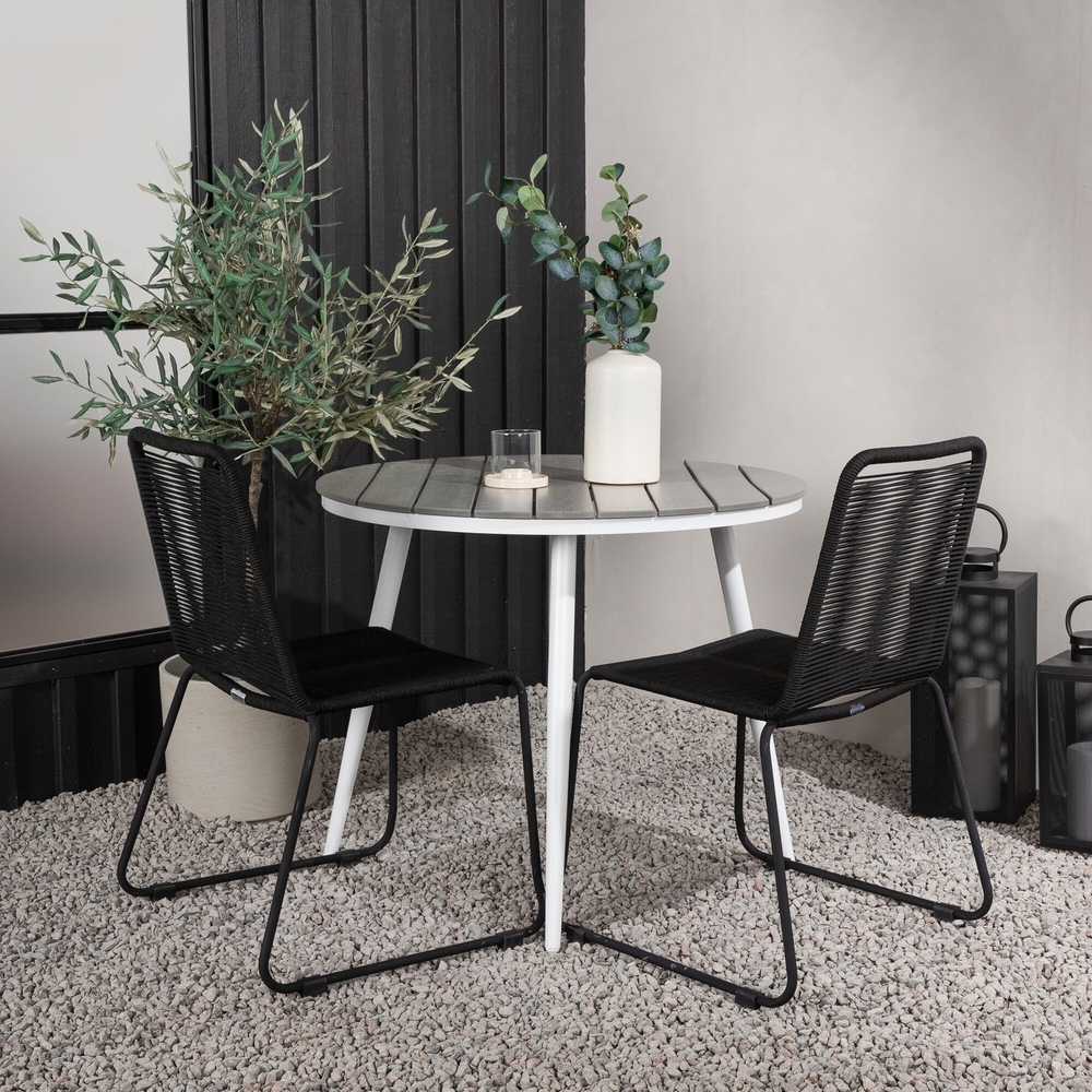 Bekväm, inbjudande och nätt cafégrupp i svart kulör passar perfekt till uteplatsen i sommar! Bordet Break har en rund bordsskiva i grå Aintwood och ett klassiskt underrede i vit aluminium. Här i perfekt kombination med smäckra stolar från serien Lindos. Stolarna har stilrent smala ben i svart aluminium och en sits i slitstarkt, svart rep. Den är också stapelbar för praktisk förvaring. Det här är en inbjudande matgrupp för två som garanterat förlänger trivsamma stunder i sommar!