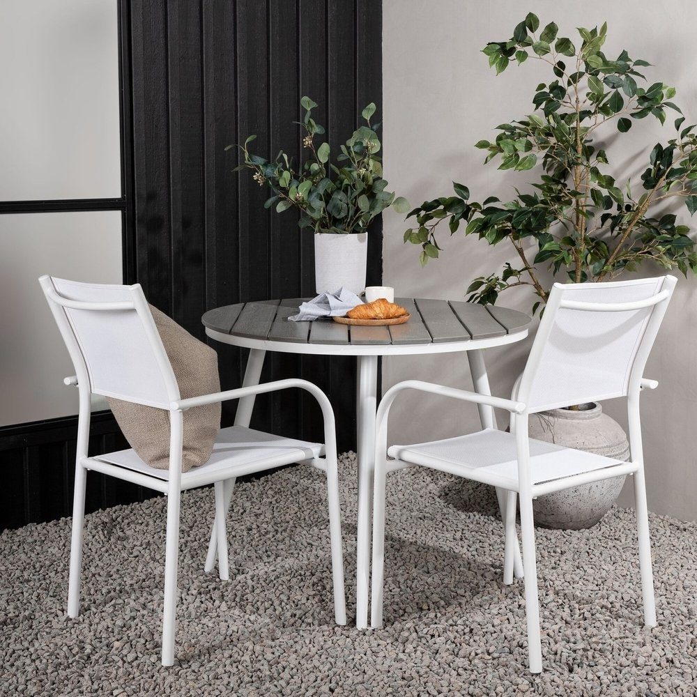 Charmig och inbjudande matgrupp för två - perfekt för sommarens alla fikastunder! Bordet Break har ett klassiskt utförande med en rund bordsskiva i Aintwood och ett klassiskt underrede i svart aluminium. Mått: 90ø cm. Här i kombination med 2st matstolar från serien Santorini. Stolarna har raka nordiska former med integrerade armstöd i aluminium och en sits i vit textilene. De är även stapelbara för praktisk förvaring. Skapa en mysig hörna på uteplatsen!