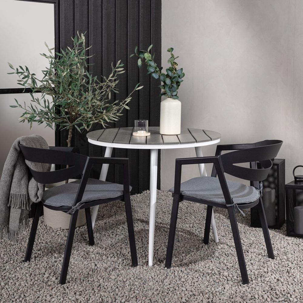 En inbjudande matgrupp för två som garanterat förlänger trivsamma stunder i sommar! Break cafébord är det perfekta bordet för sommarens alla utefrukostar och eftermiddagsfikor. Bordsskivan är i grå Aintwood och de lätt utsvängda benen i vit aluminium. Här tillsammans med trendsäkra matstolar från serien Slit, lika bekväma som moderna. Stolarna har integrerade armstöd i svart aluminium och en grå dyna för extra komfort. Sitt bekvämt och njut av trivsamma måltider!