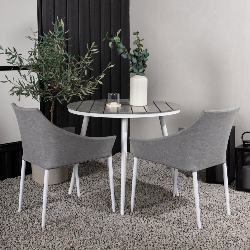 Skapa den perfekta fikaplatsen på din altan i sommar! Här kombineras tidlös design med inbjudande former i ett nätt blickfång. Matbord Break har en grå bordsskiva i grå Aintwood och ett klassiskt underrede i vit aluminium. Stolarna är från serien Spoga, en stol med fokus på stil och komfort. Den inbjudande sitsen är lätt rundad i grått tyg och benen är i vitt stål. Duka ut frukosten eller kvällsfikan och njut av somriga dagar!