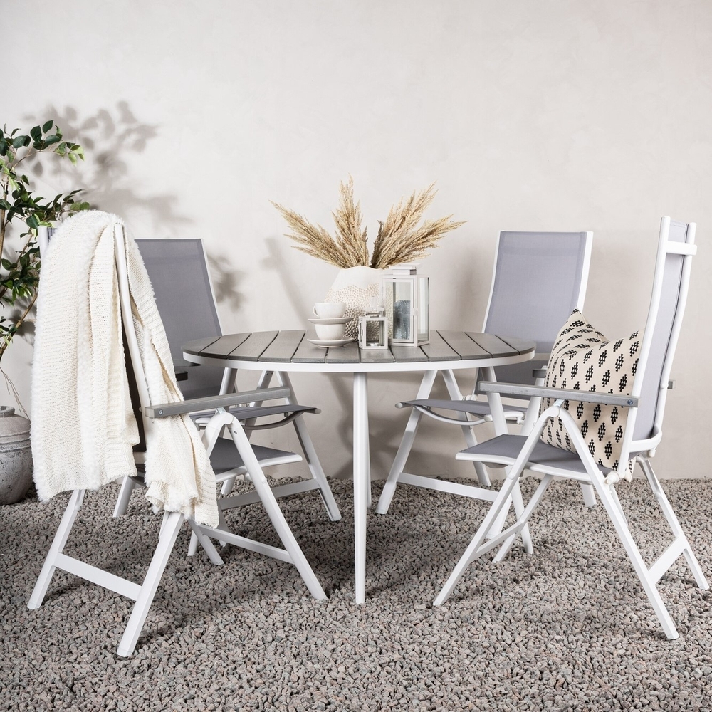 En läckert matchande matgrupp i behagliga kulörer - perfekt för sommarens alla utomhusmåltider! Matbord Break har en rund bordsskiva i grå Aintwood och ett klassiskt underrede i vit aluminium. Här tillsammans med 4st matstolar från serien Albany, en stol med fokus på komfort och tålighet. Stolen är en grå 5-positionsstol i textilene med läckra armstöd och ramkonstruktion i vit aluminium. Ryggstödet är fällbart för optimal bekvämlighet och avkoppling. Här sitter ni kvar länge och njuter av god mat!