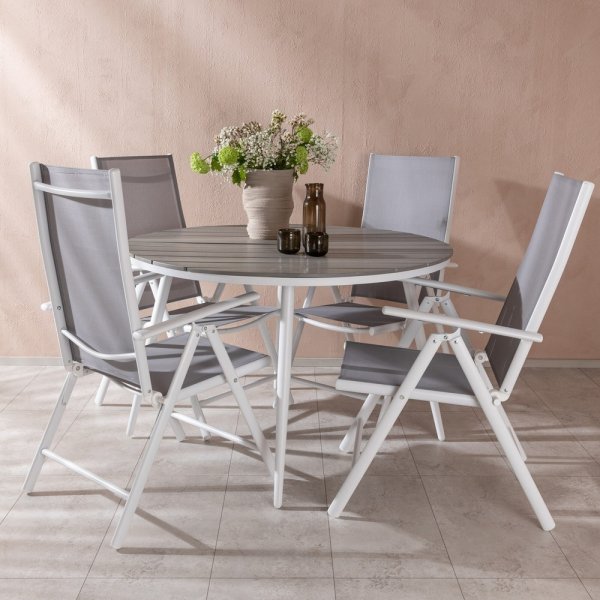 En matgrupp i klassisk design och smäcker färgskala går aldrig ur tiden - enkel att matcha och tidlös i sitt utformande! Bordet Break har en rund bordsskiva i grå Aintwood och ett klassiskt underrede i vit aluminium. Här i perfekt kombination med fällbara matstolar från samma serie. Stolarnas ryggstöd i grå textilene går att justera för optimal komfort och avkoppling kring matbordet. Skapa den perfekta mittpunkten på din altan!