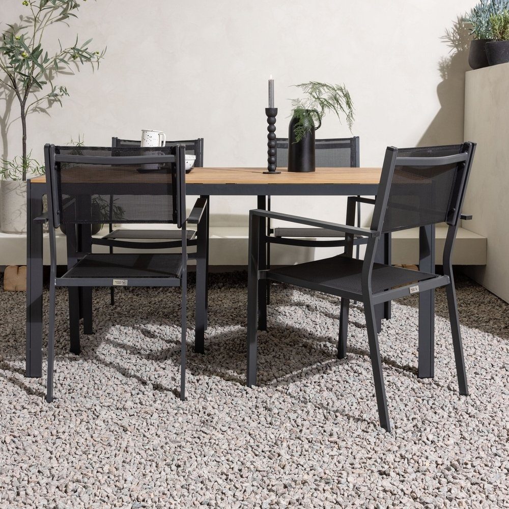Stilrent och smart - en matgrupp som passar till alla tillfällen! Vårt rektangulära matbord Break har raka former i klassisk nordisk design med en bordsskiva i Plywood och bordsben i svart aluminium. Här i snygg match med 4st av våra svarta matstolar från serien Copacabana. Stolen är stapelbar för smart förvaring, har en rak nordisk design i svart aluminium och sits i textilene. Möblera din uteplats inbjudande och trendsäkert! Bordets mått: 150x90cm.