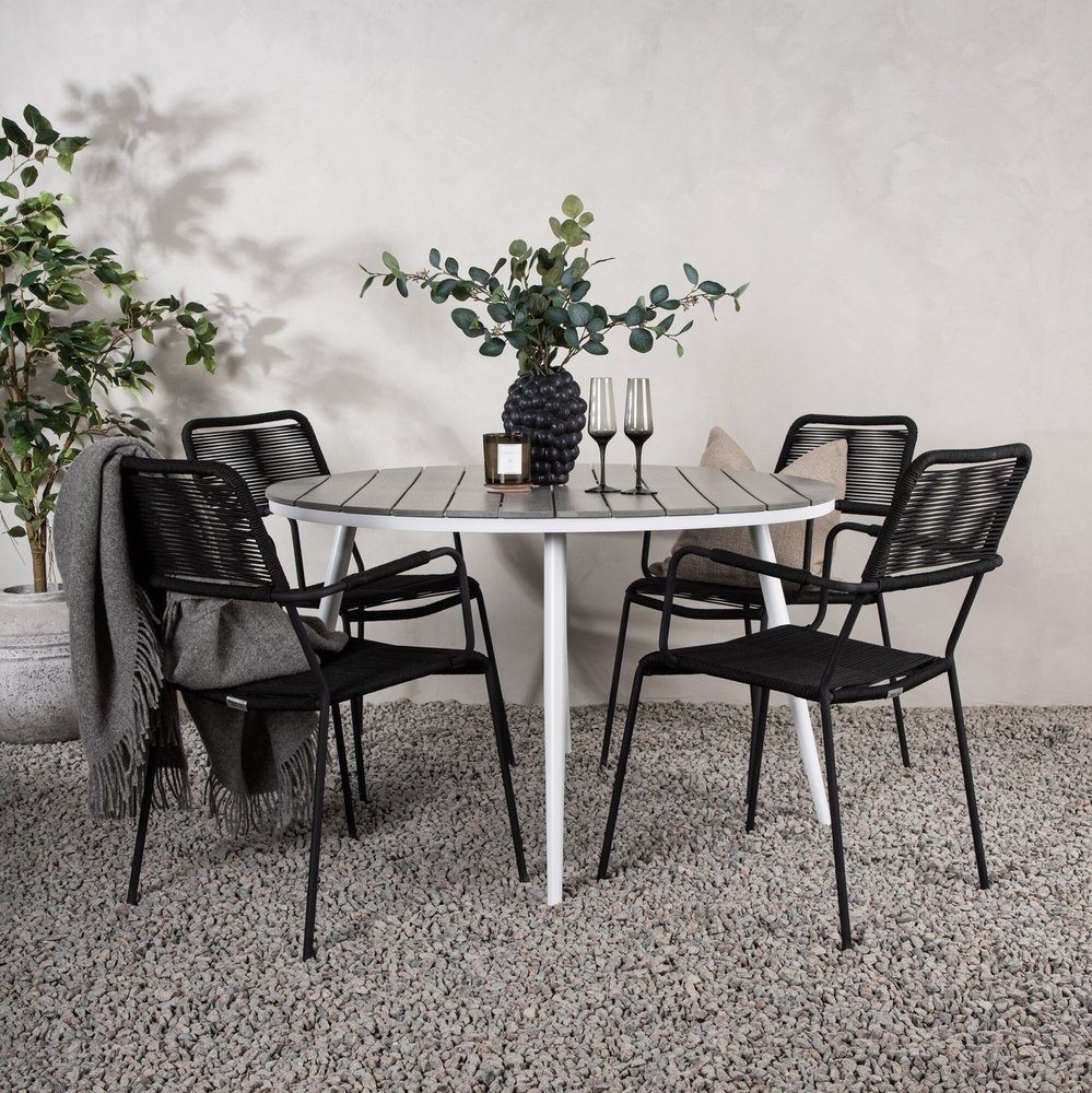 Sitt bekvämt i en inbjudande matgrupp där ingen riskerar hamna på kanten! Matbord Break har ett klassiskt utförande med en rund bordsskiva i grå Aintwood och lätt utsvängda ben i vit aluminium. Här i modern kombination med våra häftiga matstolar från serien Lindos. Stolarna har stilrent smala ben och integrerade armstöd i svart aluminium och en sits i slitstarkt, svart rep. Skapa en charmig plats för sommarens alla tillfällen!