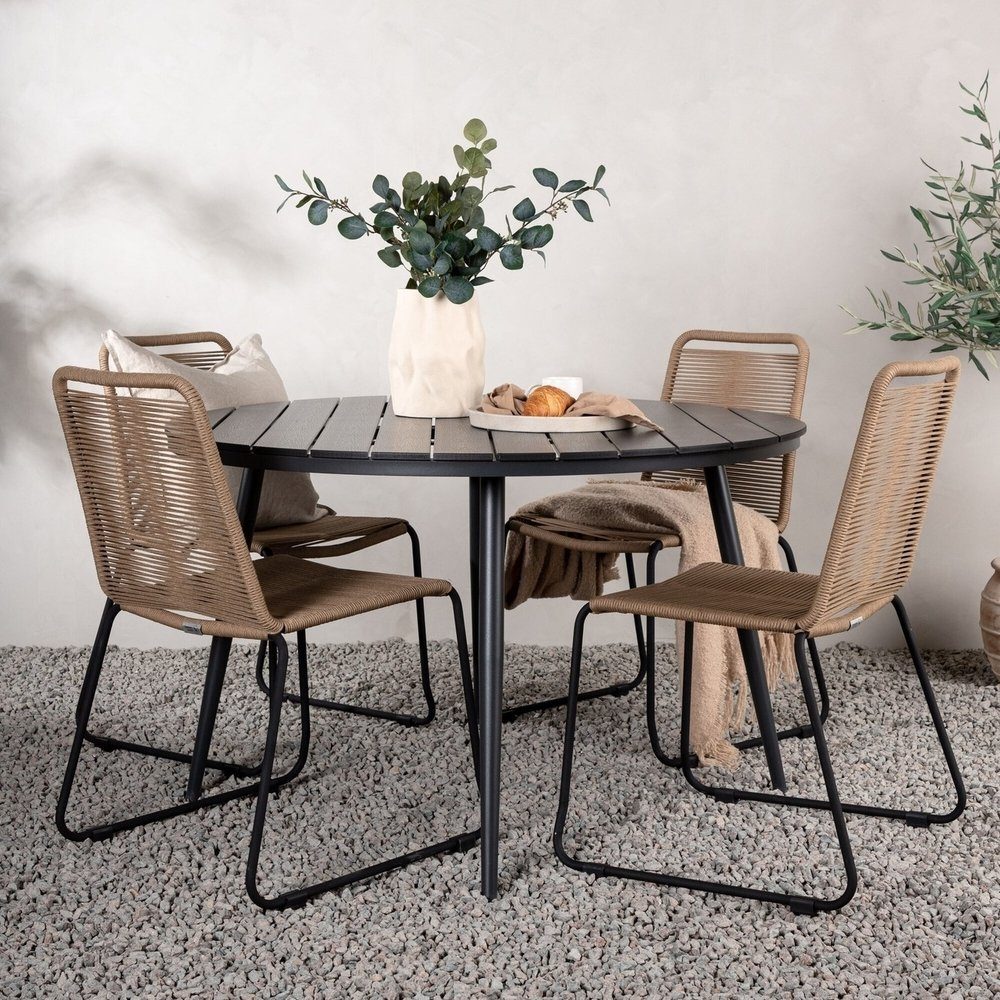 Skapa ett blickfång i uterummet eller på altanen som imponerar. Den här trendsäkra matgruppen har en genomtänkt helhetsdesign med stolar från serien Lindos i jordnära kulör och ett svart matbord från serien Break. Stolarna har stilrent smala ben i svart stål och en sits i slitstarkt lattefärgat rep. Bordet har en rund bordsskiva i Aintwood och lätt utsvängda ben i aluminium. Här får alla plats och ingen riskerar hamna på kanten!
