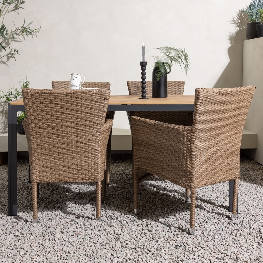 Den här matgruppen imponerar med sitt trendsäkra blickfång och höga komfort! Vårt rektangulära matbord Break har raka former i klassisk nordisk design med en bordsskiva i Plywood och bordsben i svart aluminium. Matstolarna tillhör serien Malina och står sig garanterat över tid. Stolen har en stomme i aluminium och är klädd i korgflätad, beige konstrotting. Bjud in till många härliga måltider utomhus framöver! Bordets mått: 150x90.