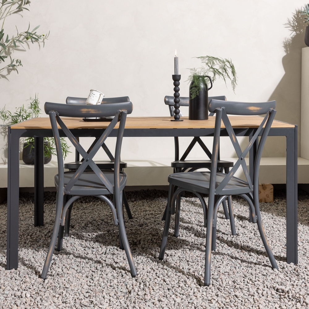 En matgrupp som matchar i smakfull Skandinavisk design! Vårt rektangulära matbord Break har raka former i klassisk nordisk design med en bordsskiva i Plywood och bordsben i svart aluminium. Här i snygg kombination med 4st matstolar från serien Tablas. Stolen har en industriell stil och är tillverkad i slitstarkt aluminium i en sotig svart kulör. Möblera i uterummet eller på altanen för att förhöja stämningen kring måltiderna framöver! Bordets mått: 150x90.