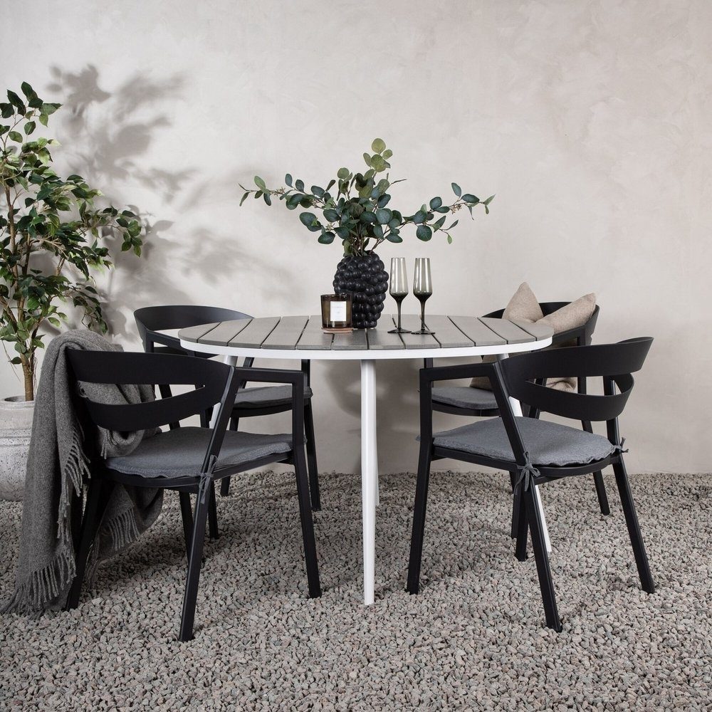 En rund matgrupp som kombinerar tidlös design med inbjudande former! Matbord Break har ett klassiskt utförande med en rund bordsskiva i grå Aintwood och lätt utsvängda ben i vit aluminium. Här i perfekt kombination med bekväma matstolar från serien Slit. Stolarna har integrerade armstöd i svart aluminium och en grå dyna för extra komfort. Skapa den perfekta fikaplatsen på din altan!