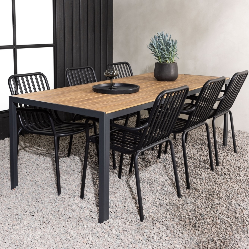 Skapa ett trendigt blickfång på din uteplats med en matgrupp som matchar! Vårt rektangulära matbord Break har raka former i klassisk nordisk design med en bordsskiva i Plywood och bordsben i svart aluminium. Här i snygg kombination med matstolar från serien Peking. Stolens ribbade utförande och sotiga svarta kulör gör att den både känns modern och tidlös. Tillverkad i aluminium som gör den enkel att flytta runt och integrerade armstöd för extra komfort. Här sitter du kvar länge och njuter på din altan! Bordets mått: 200x90cm.