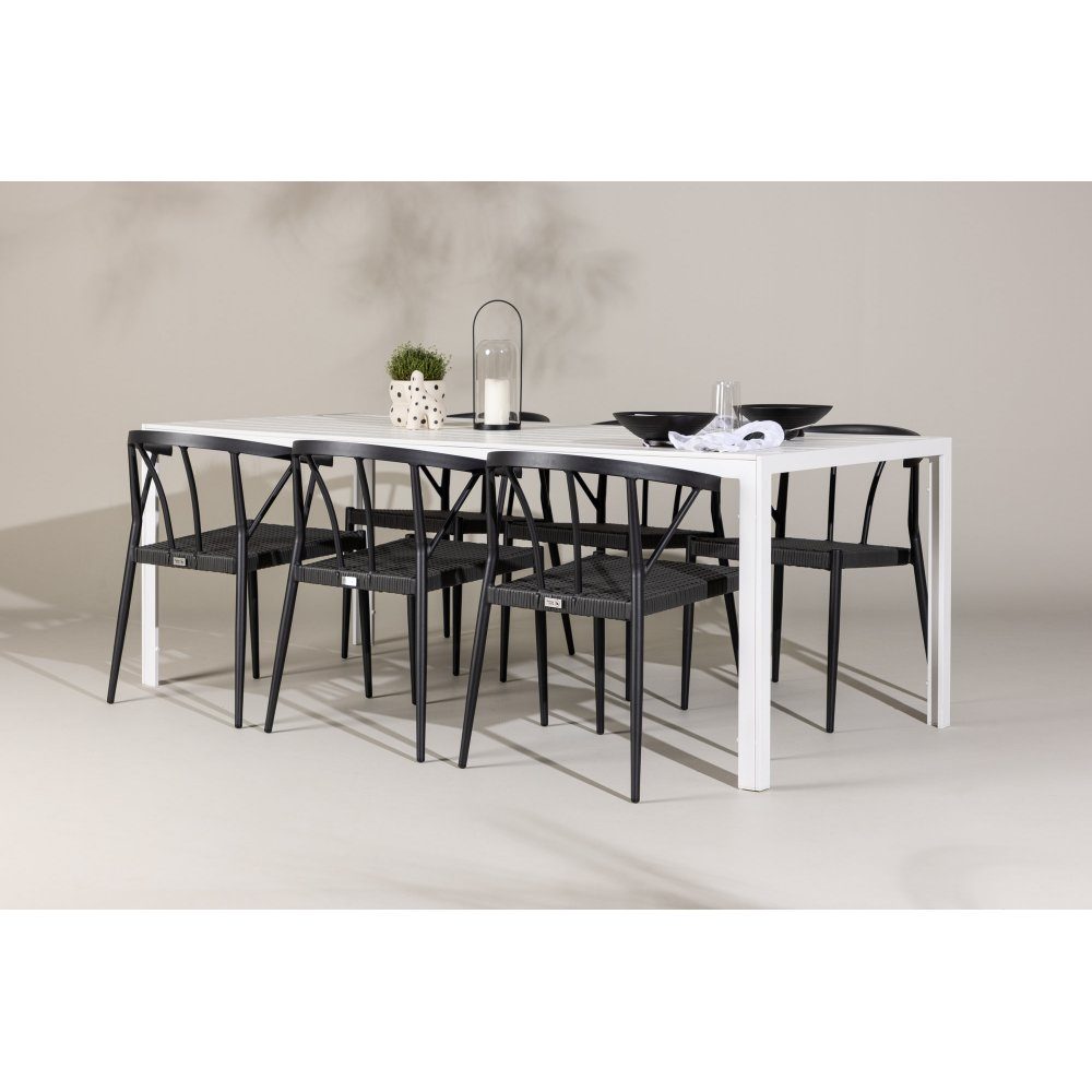 Upptäck den perfekta samlingsplatsen för både gemenskap och stil med vår matgrupp Stina och Break. Stina-stolarna kombinerar elegans och komfort med sin sits i svart konstrotting och stabila stomme i aluminium. Break-bordet blir en naturlig mittpunkt med sin vita bordsskiva i slitstarkt aintwood och en robust aluminiumstomme. Med sina generösa mått på 205x75 cm erbjuder det gott om plats för sex personer, vilket gör det idealiskt för utomhusmiddagar och sociala tillställningar. Denna matgrupp är både praktisk och stilren och skapar en inbjudande atmosfär för trivsamma stunder i trädgården eller på uteplatsen.